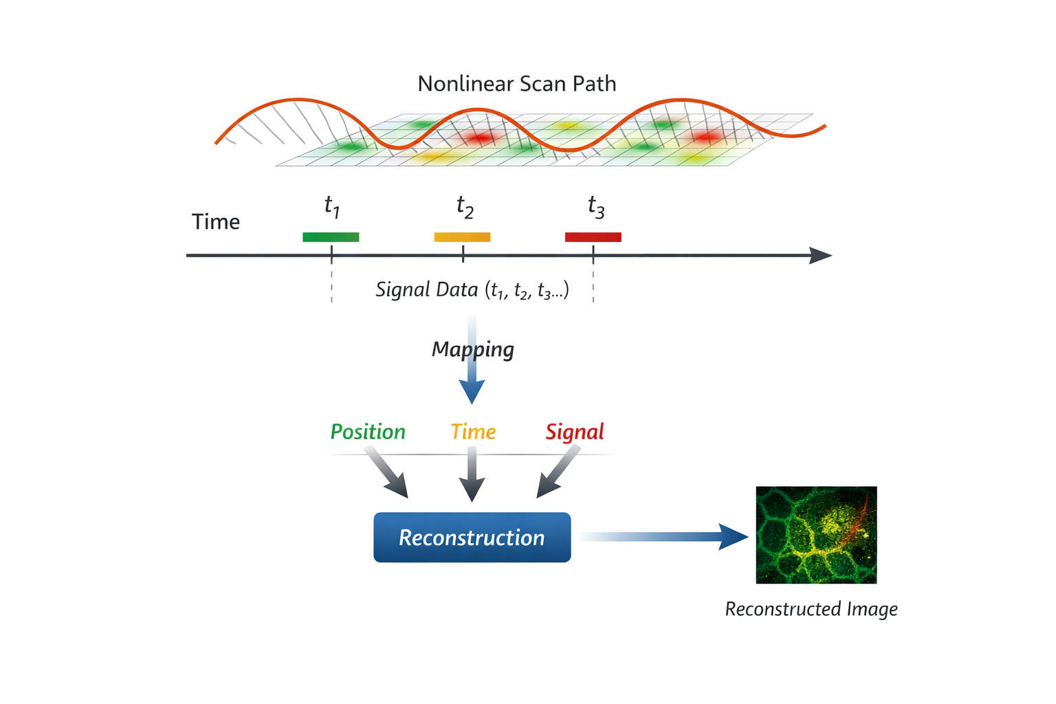 A signal is measured over time as the excitation beam moves across the sample. To form an image, the system must map:
